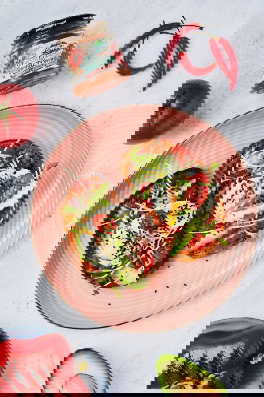 Kanapka z pastą z pomidorów i wędzonej papryki, awokado, jajkiem w koszulce, kiełkami słonecznika i czarnuszką