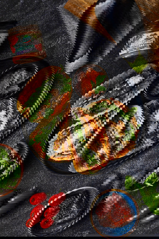 Tacos z boczniakami, pastą z bakłażana i suszonych pomidorów, musztardą, rukolą i zieloną pietruszką