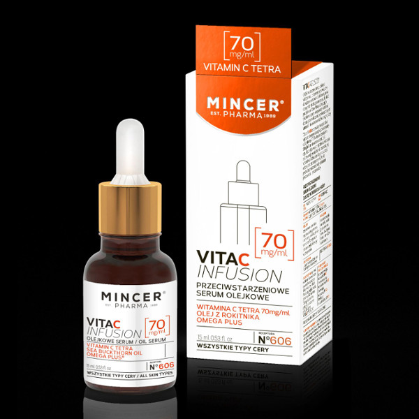Mincer Pharma, ekspert w dziedzinie pielęgnacji skóry, stworzył rewolucyjny produkt - przeciwstarzeniowe serum olejkowe N˚606. Zawiera ono największe stężenie czystej witaminy C TETRA na rynku – aż 70 mg/ml. Dzięki temu serum N˚606 z linii Vita C INFUSION pozostaje wysoce skuteczne i wykazuje swoje efektywne działanie na długo po otwarciu opakowania. Przy jego regularnym stosowaniu skóra staje się zregenerowana, napięta, wypoczęta i promienna. Zmarszczki i przebarwienia zostają zredukowane, naczynka wzmocnione, a koloryt cery ujednolicony. Preparat jest odpowiedni dla każdego typu skóry i mimo olejkowej formuły wchłania się szybko nie pozostawiając tłustego filmu. Może być stosowany na dzień i na noc, również w ciepłych i słonecznych miesiącach roku (wówczas, tak jak przy stosowaniu każdego, intensywnie działającego i rozjaśniającego preparatu, warto stosować również odpowiedni filtr przeciwsłoneczny, który zapobiegnie pojawieniu się nowych przebarwień). Oprócz przełomowej formy witaminy C Serum N˚606 zawiera również inne, aktywne biologicznie składniki, które działając synergicznie względem siebie, potęgują skuteczność preparatu. Są nimi: olej z rokitnika, odpowiedzialny za słoneczny kolor kosmetyku oraz kompleks Omega Plus bogaty w NKKT (niezbędne nienasycone kwasy tłuszczowe). Produkt cechuje przepiękny cytrusowo-ziołowy zapach.