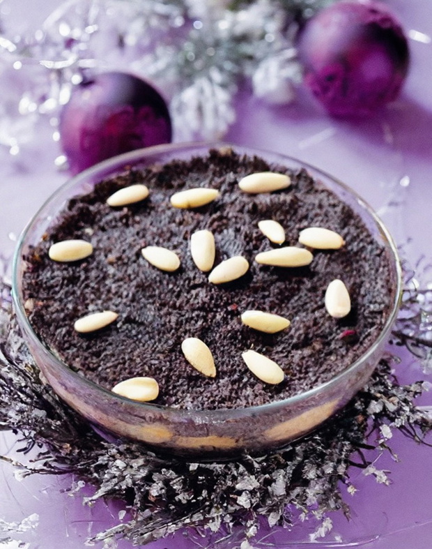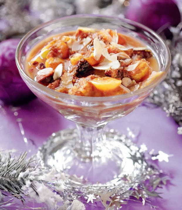 Piernik namoczyć w wodzie. Suszone owoce pokroić, gotować 10 minut, odcedzić. W wodzie, w której się gotowały, rozgotować piernik. Dodać owoce, bakalie, kompot, sok, pokrojone mandarynki i gruszki. Doprawić cukrem i sokiem z cytryny. Podawać na zimno z migdałami.