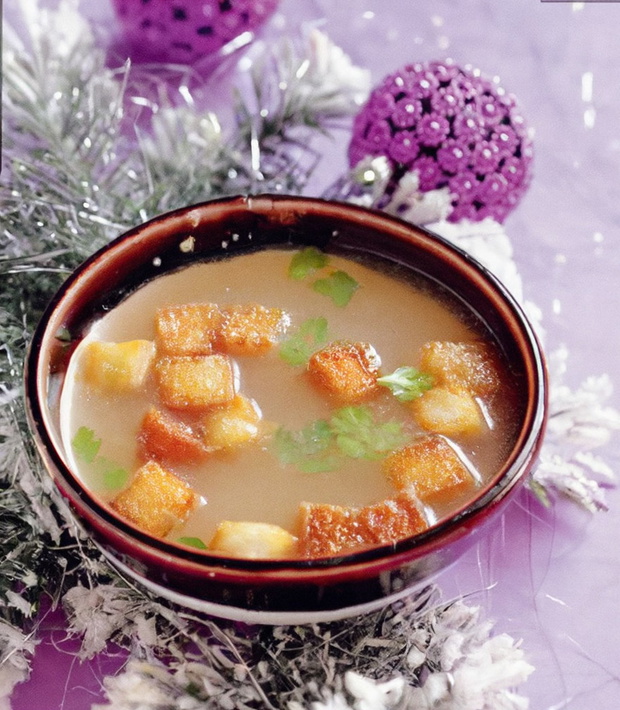 Oczyszczoną rybę zalać 2 l zimnej wody. Doprowadzić do wrzenia, zmniejszyć ogień. Dodać obraną włoszczyznę, zrumienioną na suchej patelni cebulę i przyprawy. Gotować, zdejmując z wywaru szumowiny. Przecedzić. Podawać z grzankami z bagietki, przysmażonymi na maśle. Udekorować natką.