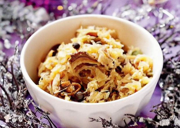 Do pokrojonej kapusty dodać namoczone grzyby, połowę wody, w której się moczyły, i przyprawy. Ugotować. Dołożyć cebulę zeszkloną na maśle i wodę z ziemniaków. Odparować.