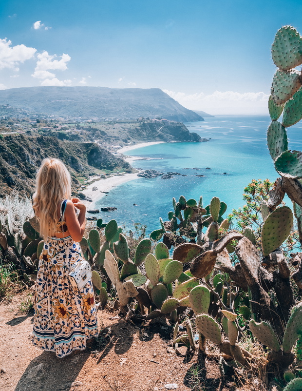 W odległości 10 minut samochodem od Tropei, przy latarni Faro del Capo Vaticano, znajduje się punkt widokowy na plażę Capo Vaticano. Zjechałam Włochy wzdłuż i wszerz i zapewniam Cię, że to jest jedno z najbardziej wyjątkowych miejsc. Śródziemnomorska roślinność, wielkie kaktusy i szmaragd wody mieszający się z błękitem nieba. To nie jest bajka – to właśnie Kalabria!