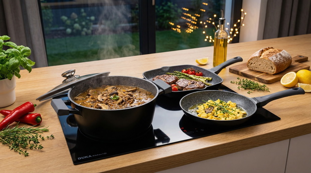Kuchnia w filozofii DUKA pełni rolę centrum domu, dlatego marka od lat stawia na wyposażenie, które łączy wygodę z trwałością. Podczas Festiwalu Zakupów uwagę zwraca kompletna seria naczyń kuchennych GOTA COOK. To propozycja dla tych, którzy chcą wprowadzić do swojej kuchni profesjonalną jakość, bez rezygnacji z nowoczesnego wyglądu.