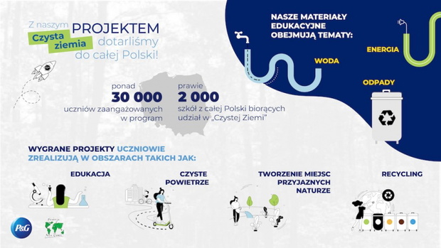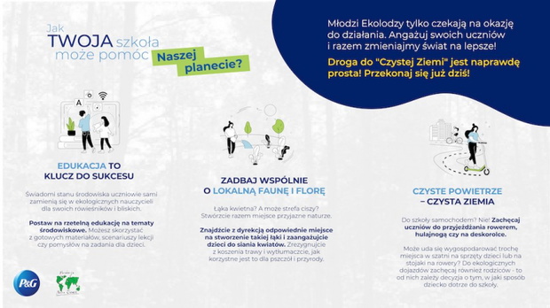 Z odpowiedzią na to wyzwanie edukacyjne przychodzą duże organizacje, np. Fundacja Nasza Ziemia i Procter & Gamble. W ramach współpracy opracowały poświęcony tematyce ekologicznej projekt edukacyjny „Czysta Ziemia”. Oszczędzanie wody, ograniczenie zużycia energii oraz segregacja odpadów, to codzienne działania, dzięki którym możemy zapobiegać zmianom klimatycznym i to na nich właśnie skupia się dopasowana do wieku treść materiałów dla uczniów z klas I-VI oraz ich starszych kolegów i koleżanek z klas VII-VIII. Scenariusze lekcji, karty pracy dla uczniów oraz plany projektów specjalnych programu pomogły nauczycielom i rodzicom zaangażować w działania na rzecz planety dotychczas ponad 30 tysięcy uczniów. W ramach akcji przeprowadzono również konkurs grantowy, aktywizujący najmłodszych uczniów szkół podstawowych, umożliwiający przekształcenie pomysłów dzieci w realne działania na rzecz klimatu.