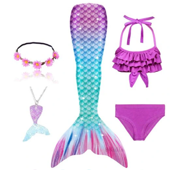 Kostium syrenka składa się ze staniczka oraz dołu w kształcie ogona syreny. Do kompletu dołączona jest sztywna płetwa, którą docelowo wkładamy w materiał. W zestawie znajdują się również majtki kąpielowe, a także wianuszek ze sztucznych kwiatów. Zestaw syrenki naprawdę robi wrażenie.
