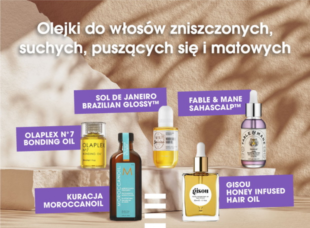 • wygładzające – działają lekko zakwaszająco na pasma, dzięki czemu domykają ich łuski i wygładzają powierzchnię, przywracając naturalny blask. Są to najczęściej olejki oparte o oleje z pestek malin, z pestek granatu, z pestek arbuza bądź z dzikiej róży, np. OLAPLEX N° 7 Bonding Oil.