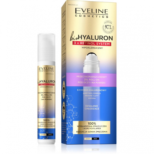 Bardzo ciekawa jest formuła żelu pod oczy w formie rollera. Dzięki sześciu formom kwasu hialuronowego i potrójnemu retinolowi, a także dodatkowi kofeiny i świetlika, produkt niweluje cienie, opuchnięcia oraz drobne zmarszczki, a także zapobiega powstawaniu nowych. Metalowa końcówka aplikatora delikatnie masuje skórę, subtelnie chłodząc i stymulując krążenie. Skóra wokół oczu i na powiekach staje się wygładzona, "kurze łapki" zredukowane a spojrzenie młodsze i pełne energii. Miły w używaniu i skuteczny w działaniu!