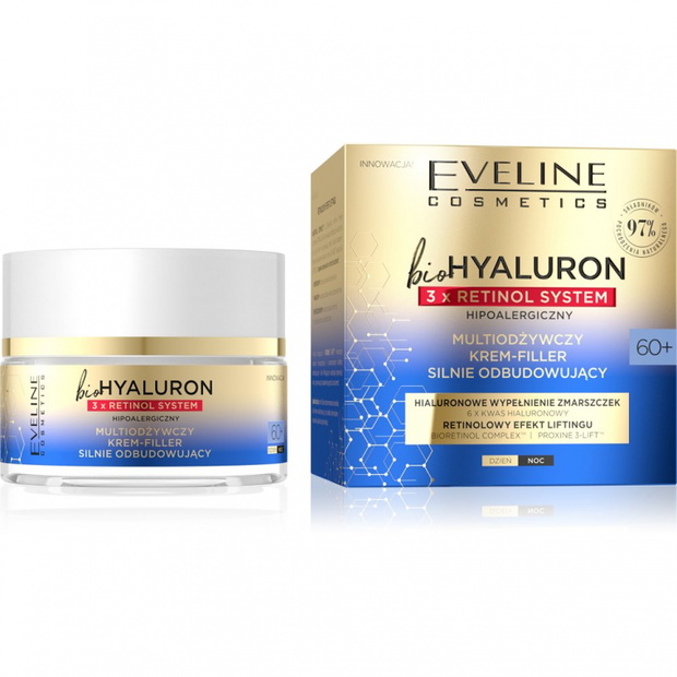 Co zatem znajdziemy w tej niezwykłej serii Eveline Cosmetics? Krem liftingujący w wersji dla kobiet 50+, 60+, 70+. Do tego serum przeciwzmarszczkowe, multinawilżające i żel pod oczy w specjalnym rollerze. Krem dla 50-latek, poza sześcioma formami kwasu hialuronowego i potrójną mocą retinolu, ma w składzie olejek różany i algi wakame oraz PROXINE 3-LIFT™ - innowacyjny kompleks heksapeptydowy o zaawansowanym działaniu odmładzającym i silnie liftingującym. Wspomaga on regenerację skóry, przywracając jej odpowiednią gęstość oraz komfort.