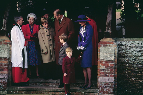 British royals Princess Margaret, Countess of Snowdon (1930-2002), Peter Phillips, Prince Philip, Duke of Edinburgh, Prince William, Prince Harry and Diana, Princess of Wales (1961-1997) attend the Christmas Day service at St Mary Magdalene Church on the Sandringham estate in Norfolk, England, 25th December 1990. (Photo by Princess Diana Archive/Getty Images)