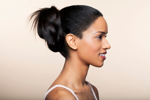Young African American woman with a braided up do in front of a natural colored background in a profile position, portrait.