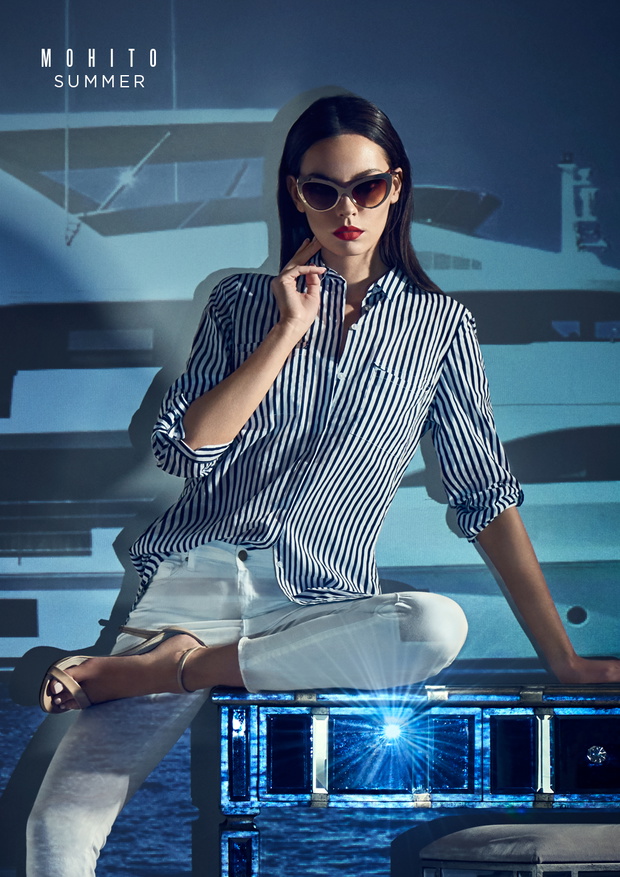 Marine na połączeniu bieli, granatu i czerwieni z ponadczasowym motywem marynarskich pasków. Bluzki z falbankami, krótkie szorty z wysokim stanem, okulary z kolorowymi oprawkami oraz obowiązkowo wysokie szpilki to kwintesencja tej tendencji w Mohito.