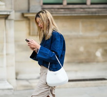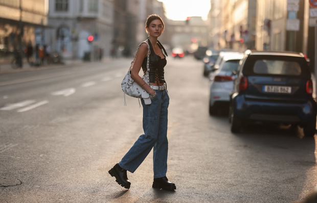 BERLIN, GERMANY – MARCH 16: Celine Bethmann wearing gold jewelry, a black crop leather top, a Balenciaga white Le Cagole big leather bag, a white belt, blue jeans and Prada black Chunky Loafer on March 16, 2022 in Berlin, Germany. (Photo by Jeremy Moeller/Getty Images)