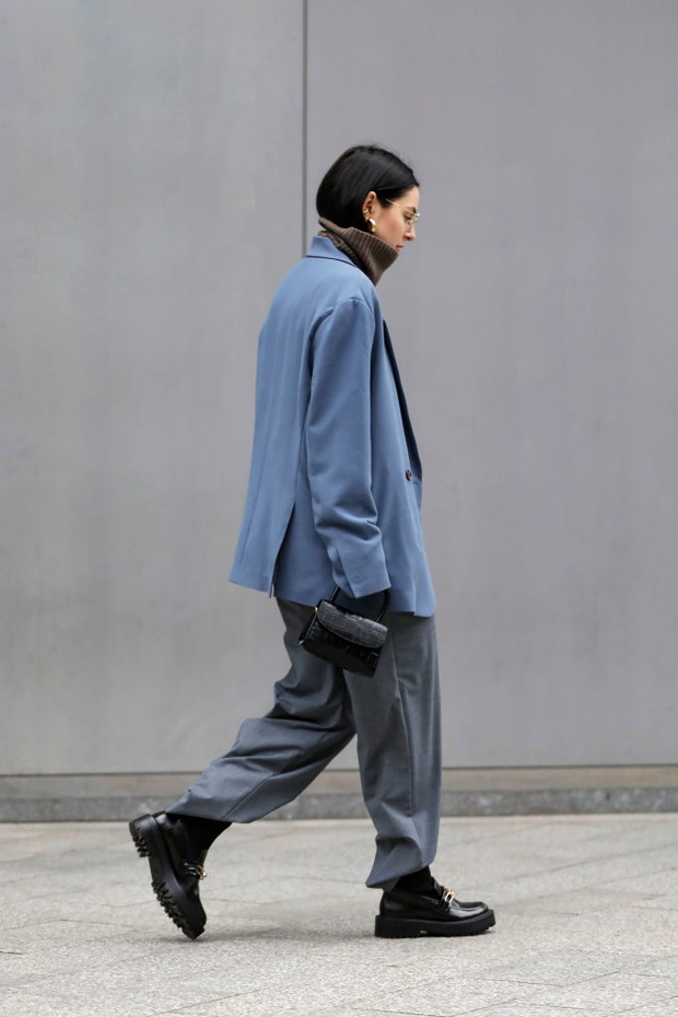 DUESSELDORF, GERMANY – NOVEMBER 15: Influencer Maria Barteczko, wearing a blue oversized blazer by Seventh, a brown oversized cashmere turtleneck pullover by Arket, grey wide leg pants by Zara, black chunky loafers by Zara, a black mini croco leather bag by By Far, gold bold hoop earrings by Monki and gold round retro glasses by Ray-Ban during a street style shooting on November 15, 2020 in Duesseldorf, Germany. (Photo by Streetstyleshooters/Getty Images)
