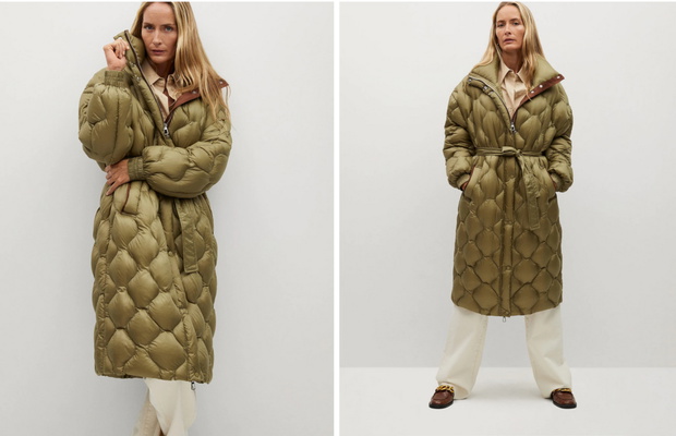 To jeden z najciekawszych modeli zimowych kurtek, jaki znalazłyśmy w znanych sieciówkach. Długa, oliwkowa, pikowana kurtka na zimę Mango totalnie nas oczarowała! Oczywiście to model, który nie każdej z Was przypadnie do gustu. Poprzez swoje pikowania jest bardziej ozdobna niż większość kurtek na zimę. Jednak naszym zdaniem to wspomniane pikowania właśnie – oraz brązowe wstawki – sprawiają, że zimowa kurtka Mango jest tak wyjątkowa!