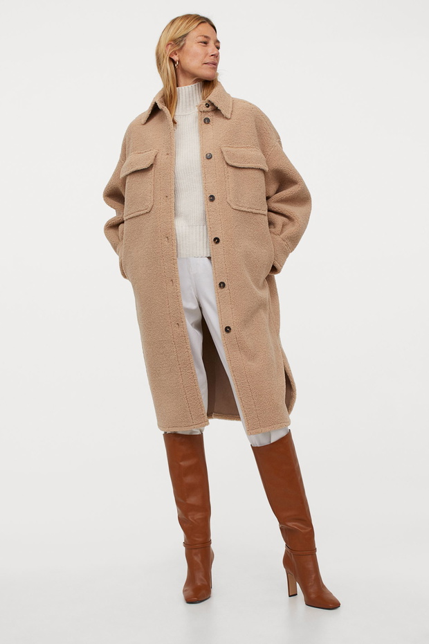 Zimowa kurtka H&M łączy w sobie dwa wiodące trendy – koszulową kurtkę, katanę oraz futerkowego „misia”. Ma bowiem krój długiej, flanelowej koszuli, ale materiał, z którego została uszyta przypomina futerko klasycznych „misiowych” płaszczy i kurtek.