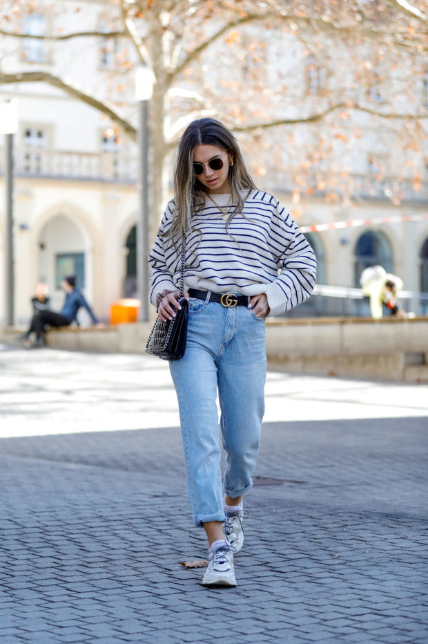 WUERZBURG, GERMANY – MARCH 01: Influencer Amelie Weissenberger wearing white and grey sneaker by Selected, a white and dark blue striped pullover by Zara, light blue denim jeans pants by Zara, a black bag with silver chain detail by Zara, a black belt with a gold buckle by Gucci and sunglasses by Ray-Ban during a street style shooting on March 1, 2021 in Wuerzburg, Germany. (Photo by Streetstyleshooters/Getty Images)