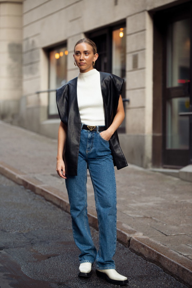 STOCKHOLM, SWEDEN – SEPTEMBER 01: Lisa Olsson wearing blue jeans, white top and black leather vest outside StyleIn during Stockholm fashion week Spring/Summer 2022 on September 01, 2021 in Stockholm, Sweden. (Photo by Raimonda Kulikauskiene/Getty Images)