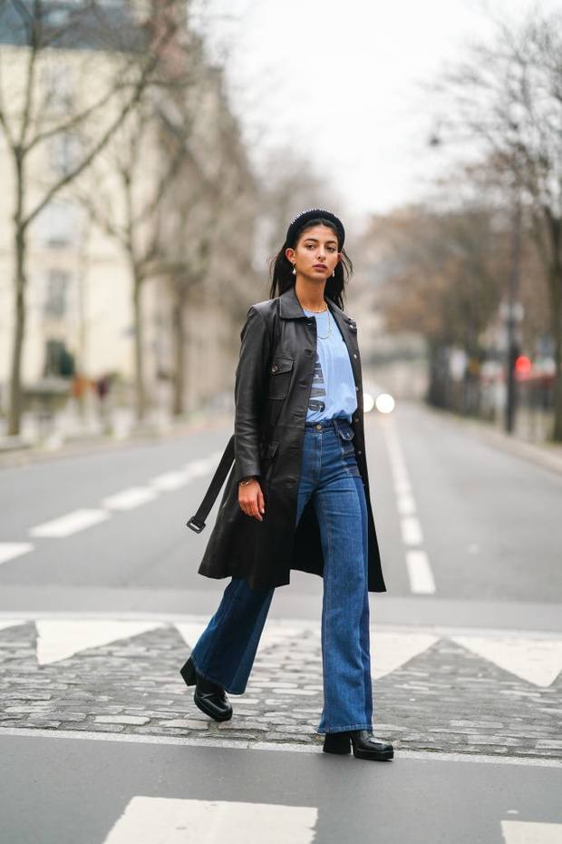 PARIS, FRANCE – FEBRUARY 09: Melanie Darmon wears pearl earrings, a headband from Maison Margiela, a black leather long coat from Gerard Darel, a golden necklace, a blue t-shirt from Margiela, a brown suede bag with leather parts from Gerard Darel, blue flared denim jeans / pants from Gerard Darel, black leather shoes from Nodaleto, on February 09, 2021 in Paris, France. (Photo by Edward Berthelot/Getty Images)