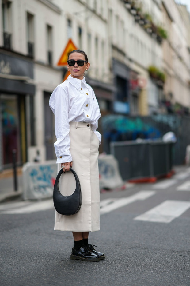 PARIS, FRANCE – OCTOBER 02: A guest wears black Ray Ban sunglasses, earrings, a white oversized shirt, high waist white latte slit / split skirt, a black shiny leather Coperni handbag, silver rings, black socks, black shiny leather laces shoes from Dc Martens, outside Vivienne Westwood, during Paris Fashion Week – Womenswear Spring Summer 2022, on October 02, 2021 in Paris, France. (Photo by Edward Berthelot/Getty Images)