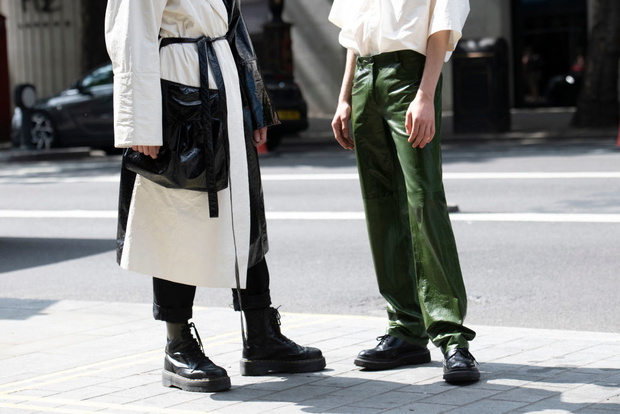 LONDON, ENGLAND – JUNE 10: Digital Influencer Lucas Ruska Martin wears Doc Marten boots, Joshua Millard jacket with Digital Influencer Mikko Puttonen wearing a Hugo by Hugo Boss top, Adieu shoes, Joshua Millard trousers during London Fashion Week Men’s on June 10, 2018 in London, England. (Photo by Kirstin Sinclair/Getty Images)