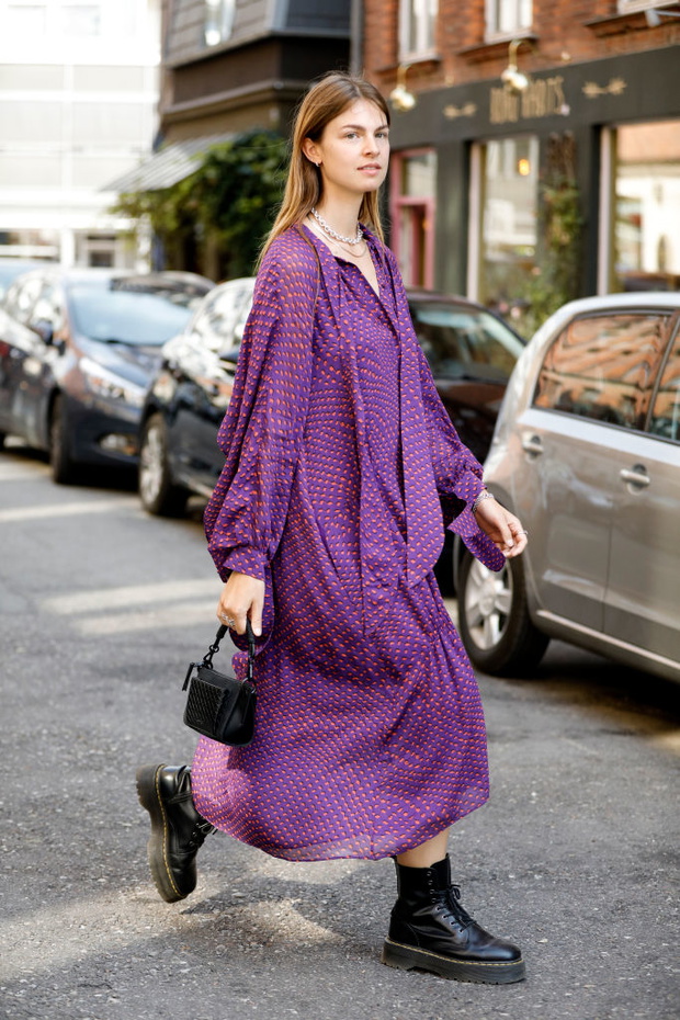 COPENHAGEN, DENMARK – AUGUST 10: Influencer Influencer Jacqueline Zelwis, wearing a lila colored dress with orange pattern by Lala Berlin, a black bag by Lala Berlin, chains by Black Palms and black boots by Dr. Martens seen at Copenhagen Fashion Week Spring/Summer 2021 outside the Malaika Raiss presentation on August 10, 2020 in Copenhagen, Denmark. (Photo by Streetstyleshooters/Getty Images)