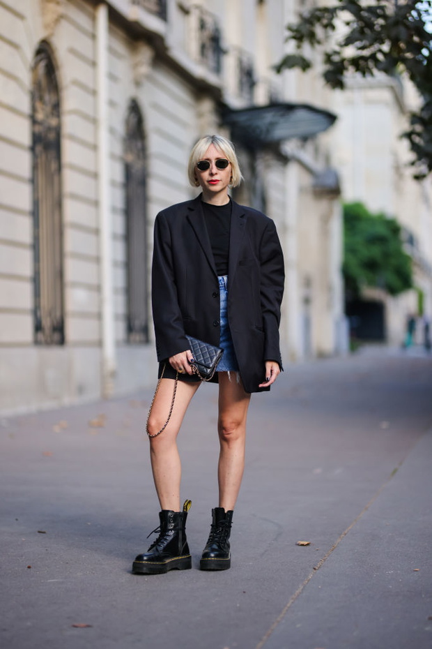 PARIS, FRANCE – AUGUST 25: Emy venturini wears black vintage RayBan sunglasses, gold large earrings, a gold chain necklace, a black halter-neck cropped t-shirt from Zara, a black oversized vintage blazer jacket from Prada, a gold chain bracelet, a gold ring, a black shiny grained leather WOC crossbody bag from Chanel, a blue faded high waist ripped short skirt from Levi’s, black shiny leather laces ankle boots from Dr Martens, on August 25, 2021 in Paris, France. (Photo by Edward