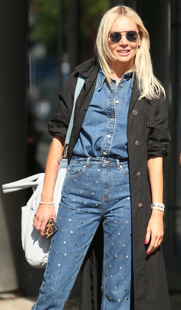 Postawiła na wyjątkowo modny w tym sezonie jeansowy total look nawiązujący do stylu kowbojskiej dziewczyny. Jego podstawą jest jeansowa koszula, jeansowe spodnie zdobione dżetami i lekki jesienny płaszcz.