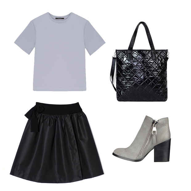 Gwiazda miała na sobie prostą, ale bardzo efektowną stylizację codzienną. Szary, gładki t-shirt zestawiła z rozkloszowaną spódnica w kolorze czarnym. Również dodatki – botki za kostkę i duża torebka utrzymane były w kolorystyce ubrań.