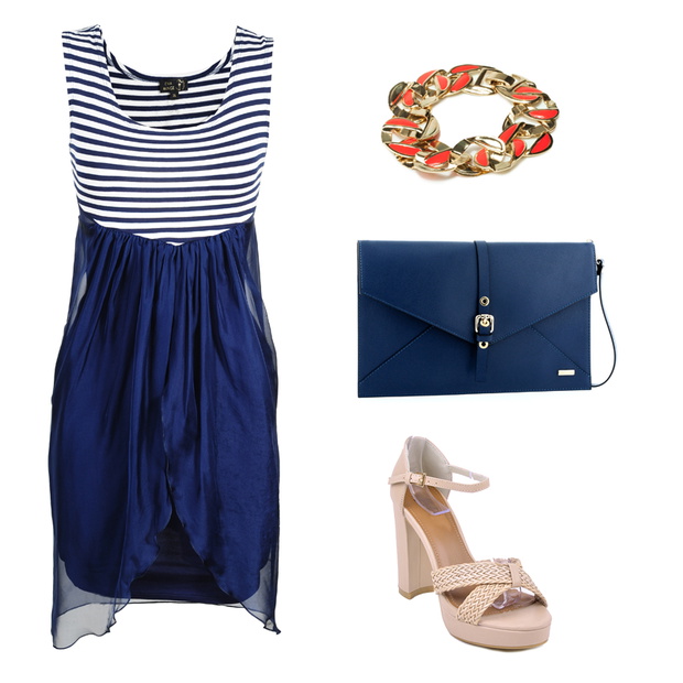 Druga propozycja jest bardziej elegancka. Marynarska sukienka z kolekcji Evy Minge łączy paski na górze z delikatną tkaniną na dole. Proste dodatki czyli beżowe sandałki z plecionym przodem oraz granatowa kopertówka podkreślają marynarski styl. Kolorowym akcentem tej stylizacji jest złota bransoletka z dodatkiem koloru pomarańczowego.