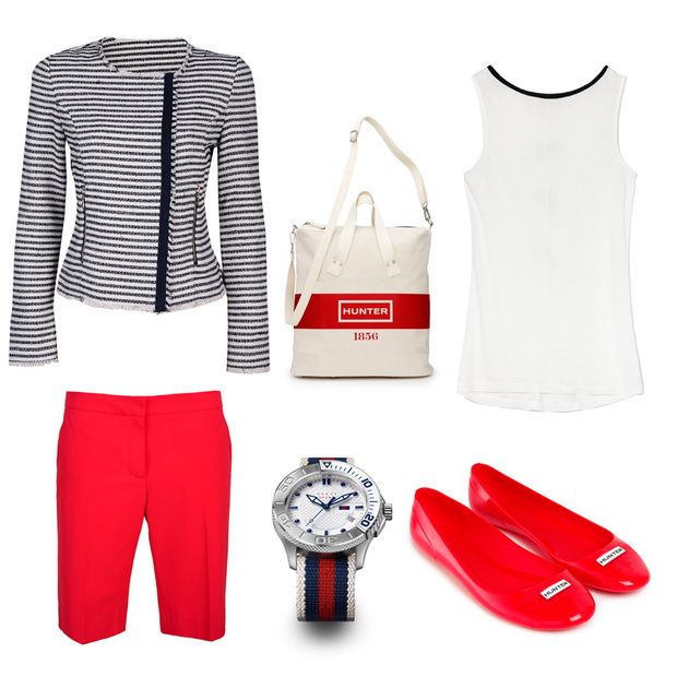 Kolejna stylizacja łączy w sobie gorącą czerwień z chłodnym granatem i neutralną bielą. Eleganckie szorty w kant świetnie mogą zastąpić spódnicę. Tu zestawione z białym topem i żakietem w paski zbudowały zestaw w stylu sportowej elegancji. Duża torba o marynarskim charakterze dobrze koresponduje ze sportowym zegarkiem i wygodnymi baletkami.