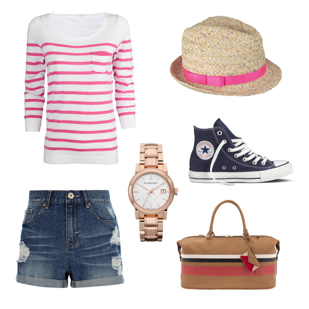 Pierwsza propozycja to casualowy zestaw z szortami. Ich podniesiony stan świetnie wydłuża nogi. Zamiast tradycyjnej czerwieni użyto bardziej kobiecego różu. Pojawia się on na białym sweterku oraz małym kapeluszu. Wygodne trampki pozwolą na swobodne bieganie przez cały dzień. Zestaw sprawdzi się na rowerowej wycieczce, pikniku czy zwiedzaniu nowych miejsc.