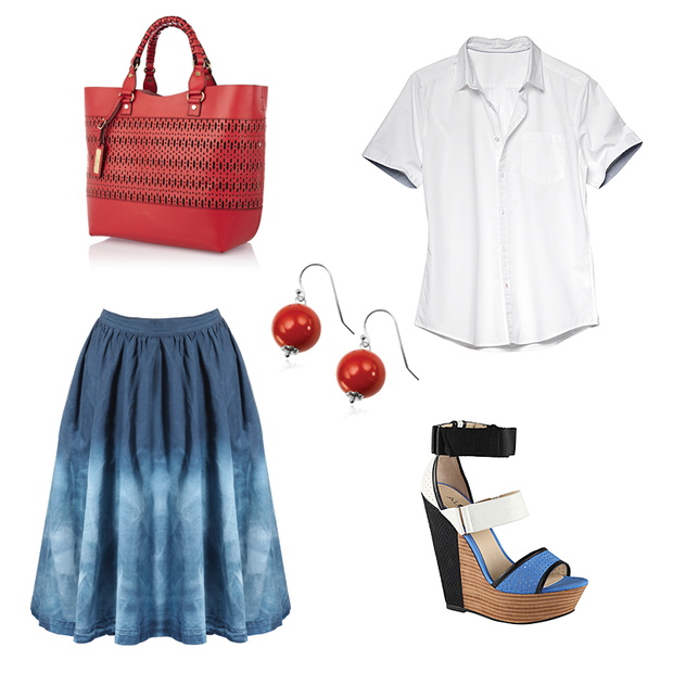 Ostatni zestaw to ukłon w stronę stylu boho. Rozkloszowana spódnica w kilku odcieniach granatu sięga do połowy łydki dlatego została zestawiona z butami na wysokich koturnach, które wysmuklają nogi. Pasuje do tego idealnie biała koszula to podstawowy element w kobiecej szafie – tu w letniej wersji z krótkim rękawem. Czerwonymi akcentami są kolczyki oraz ażurowa torebka o modnym fasonie shopper bag.