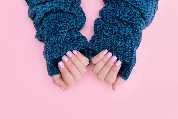 Female hands manicure close up view on pink knitted sweater background. Nail painting effects. Manicure salon banner concept