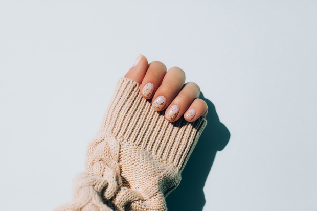 Unrecognizable female in soft knitted sweater showing stylish manicure with parts of golden glittering foil against gray background. Top View. Trendy manicure of the year.