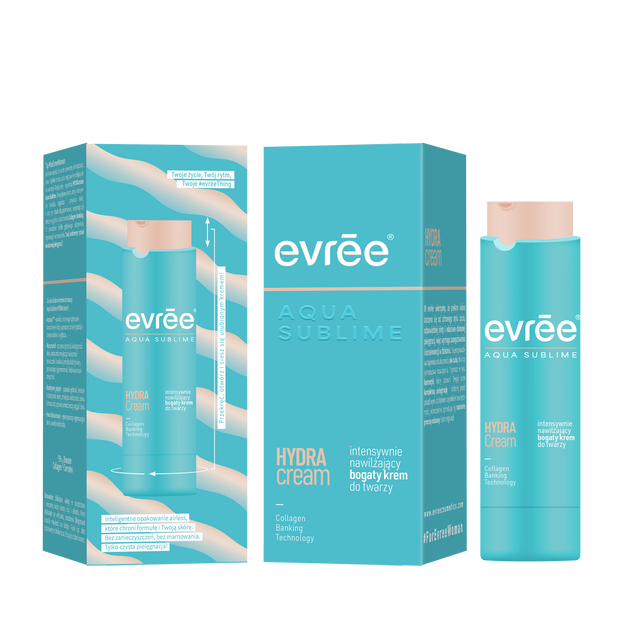 Ten bogaty krem będzie doskonały #ForEvreeWoman do pielęgnacji twarzy, szyi dekoltu oraz okolic oczu. Mimo swojej bogatej konsystencji, jest łatwy i przyjemny w aplikacji oraz pozostawia satynowe wykończenie. Podobnie jak żel-krem, zapewnia głębokie nawilżenie skóry w technologii 3D i może być stosowany samodzielnie, na wybrane serum evrēe lub jako baza pod makijaż. Poza utrzymującym optymalne nawodnienie i dbającym o stan bariery hydrolipidowej naskórka Aquaxylem™, zawiera także zmniejszający oznaki starzenia niacynamid oraz bioaktywne peptydy. Te ostatnie, działając na poziomie komórkowym, pobudzają fibroblasty do produkcji kolagenu, co jest kluczowe dla jędrności i elastyczności skóry.