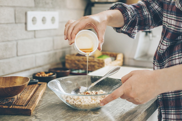Woman making granola at home. Female hands pouring honey