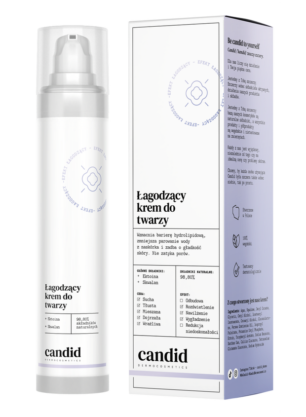 Łagodzący krem do twarzy Candid, oparty na połączeniu ektoiny i skwalanu, działa wielokierunkowo – intensywnie nawilża, koi skórę i wspiera jej odbudowę. Skwalan pomaga utrzymać elastyczność i odpowiedni poziom nawodnienia, tworząc na powierzchni skóry delikatną warstwę ochronną. Ektoina natomiast wzmacnia jej odporność na czynniki zewnętrzne i zmniejsza skłonność do podrażnień.