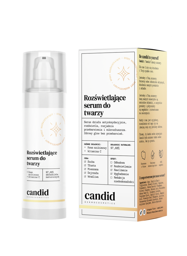 Rozświetlające serum Candid z kwasem szikimowym i witaminą C wspiera procesy odnowy naskórka, pomagając wygładzić jego strukturę i zredukować widoczność przebarwień. Jednocześnie działa antyoksydacyjnie, chroniąc skórę przed stresem oksydacyjnym i wspierając jej naturalną świetlistość. Skóra zyskuje bardziej jednolity koloryt, świeżość i subtelne rozświetlenie, odzwierciedlające filozofię healthy glow.