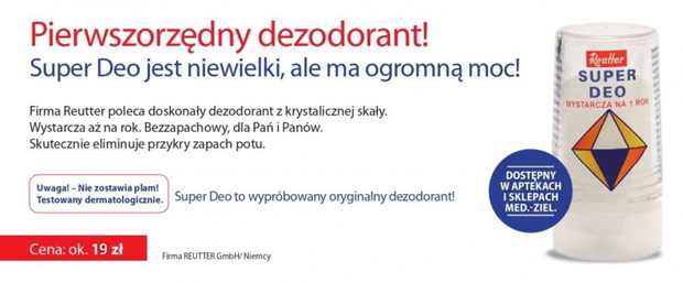 Jeśli chcesz przekonać się już po pierwszym zastosowaniu jak skutecznie działa dobry dezodorant, to prosto z apteki lub sklepu medyczno-zielarskiego zastosuj Super Deo niemieckiej marki Reutter.