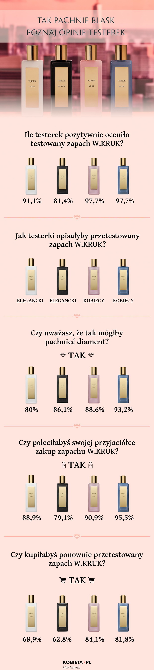 Marka W.KRUK stworzyła premierowe zapachy inspirowane kolorowymi diamentami. Każdy zapach ROSE, PURE, BLACK i BLUE został przetestowany przez 50 testerek. Sprawdźcie jak uczestniczki Klubu Testerek oceniły przetestowane zapachy.