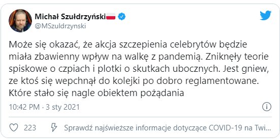 Paradoksalnie, może okazać się, że to, co mogło całej akcji zaszkodzić, w istocie jej pomaga. Miejsce teorii spisowych o czipach i skutkach ubocznych zajęło oburzenie i poczucie niesprawiedliwości. Szczepionki, do których dostęp miał być egalitarny, budziły podejrzenia. Szczepionki, dostępne dla znanych osób poza kolejnością, stać mogą się zaś pożądane. Na ten fakt zwraca uwagę Michał Szułdrzyński z „Rzeczpospolitej”.