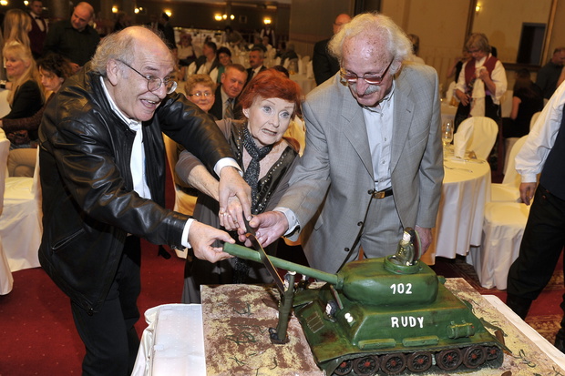Premiera książki "Franciszek Pieczka" Dariusza Domańskiego. Włodzimierz Press, Barbara Krafftówna i Franciszek Pieczka kroją tort / fot. AKPA