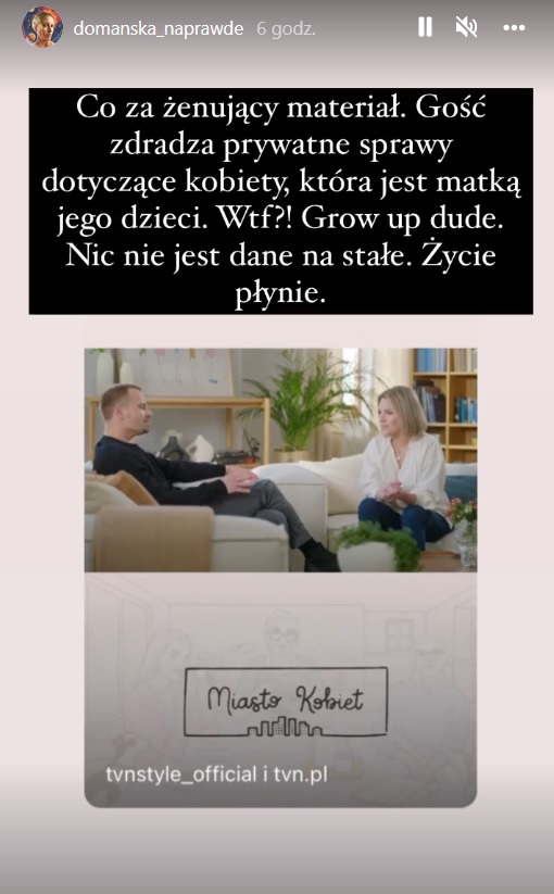 - Co za żenujący materiał. Gość zdradza prywatne sprawy dotyczące kobiety, która jest matką jego dzieci. WTF?! Grow up dude. Nic nie jest dane na stałe. Życie płynie - napisała na Instagramie Aleksandra Domańska.