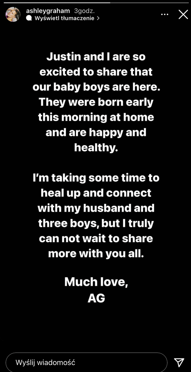 Ashley Graham to najprawdopodobniej najpopularniejsza modelka plus size. Jest także inspiracją dla wielu kobiet i ambasadorką ruchu “body positive”. Kiedy spodziewała się bliźniąt, często pokazywała z dumą swoje ciało. Regularnie publikowała kolejne zdjęcia z ciążowym brzuszkiem, nie ukrywając rozstępów czy cellulitu. Ostatnią fotografię na Instagramie, na której pozuje jedynie w limonkowym swetrze, podpisała “extended stay”. Możemy się domyślać, że oznaczało to, że bliźniaki pojawią się na świecie lada dzień. Wczoraj za pomocą InstaStory Ashley Graham poinformowała swoich obserwatorów, że jest już po porodzie.