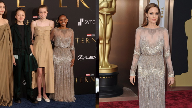 Niecały tydzień wcześniej, podczas premiery filmu Eternals w Los Angeles, szesnastoletnia Zahara Jolie-Pitt założyła tę samą srebrną suknię Elie Saab Couture w stylu vintage, którą Angelina Jolie ubrała na rozdanie Oscarów w 2014 oku. na rozdaniu Oscarów w 2014 r.