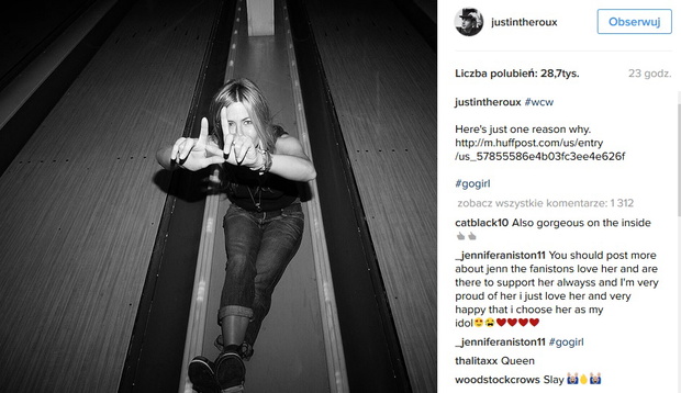 Jennifer Aniston jest w od zeszłego roku szczęśliwą żoną aktora i scenarzysty Justina Theroux, który bardzo mocno wspiera żonę w dyskusji na temat granicy prywatności i medialnym hienom. Wraz z pojawieniem się listu w sieci, Theroux wrzucił na swój Instagram portret Aniston z hashtagiem #go Girl.