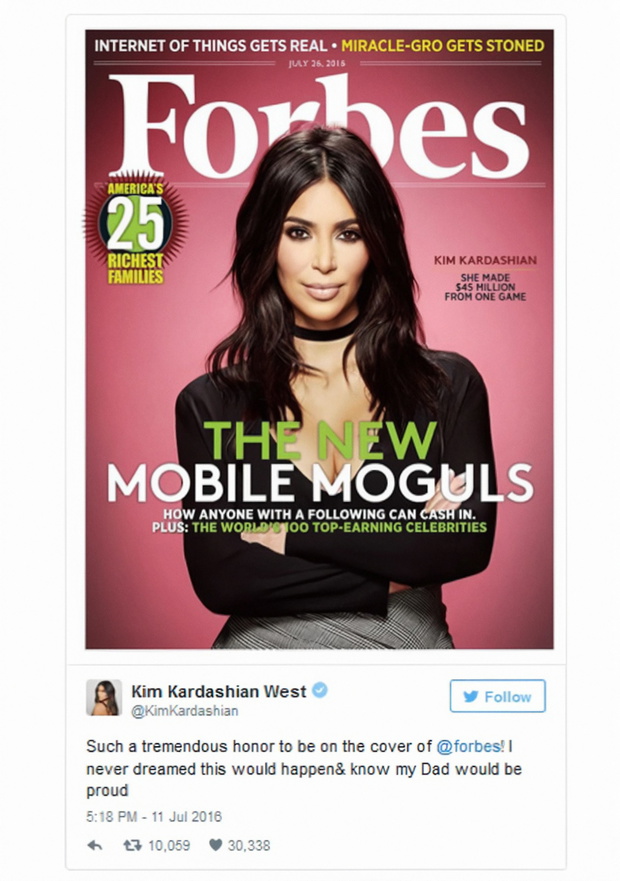 Jak i dlaczego autorka książki z selfie znalazła się w Forbes? Cóż, gwiazda jest niczym Midas handlu. Wszystko czego się dotknie, po prostu się sprzedaje. Jej aplikacja z własnymi emoji, przedstawiającymi oczywiście samą Kim (Kimoji) i mobilna gra wideo przyniosły jej 52,5 milionów dolarów w 2015 roku. Sesji w magazynie towarzyszy też wywiad z bizneswoman, która twierdzi, że od dłuższego czasu interesuje się nowymi technologiami i zaczęła spędzać bardzo dużo czasu w San Francisco, centrum innowacji. Teraz na tym właśnie chce budować dalszą karierę.