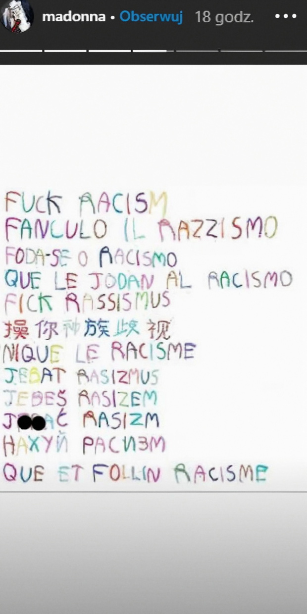Tuż po wynikach polskich wyborów prezydenckich na stories piosenkarki pojawiła się grafika z hasłami sprzeciwiającymi się rasizmowi, ale symbolicznie w rozumieniu wszelkiego rodzaju dyskryminacji. I nie ma tu miejsca na kurtuazję. Madonna w ostrych jak "cień mgły" słowach wyraża, co o tym myśli, więc jak się domyślacie - grzeczności odkłada na bok.