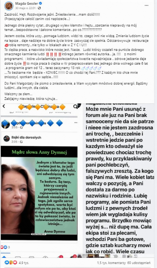 - Zazdrość. Hejt. Rozdwojenie jaźni. Zniesławienie... Mam dość! Jednego dnia piękny cytat, a drugiego wylew kłamstw i hejtu. Szerzenie nieprawdy na mój temat, bezpodstawne i żałosne komentarze. Po co? Jestem osobą, która uczy, pomaga, widzi to, czego inni nie widzą. Zmienia ludziom życie na lepsze, daje nadzieję na dobre życie, które zazwyczaj się spełnia. Odczarowuję restauracje, robię remonty nie tylko w lokalach, ale i życiu.